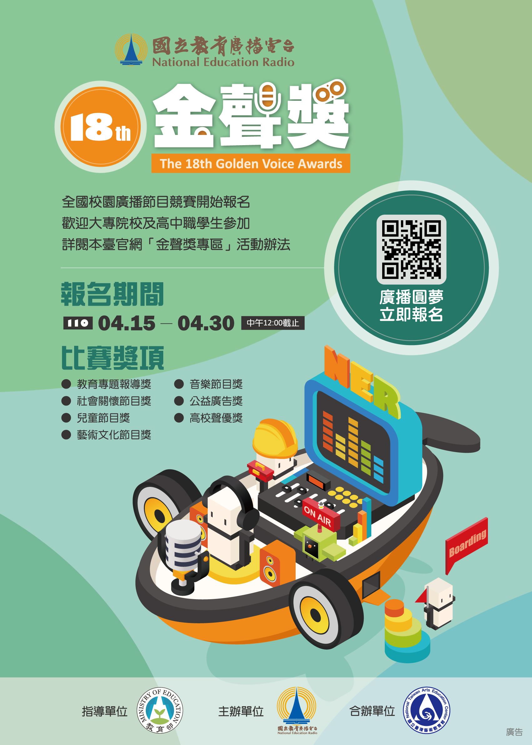 「第18屆金聲獎」校園廣播節目競賽,報名日期自4月15日(星期四)起至4月30日(星期五)中午12:00截止收件。本屆競賽項目7大獎項,包括教育專題報導獎、社會關懷節目獎、兒童節目獎、藝術文化節目獎、音樂節目獎、公益廣告獎、高校聲優獎,歡迎大學及高中職學生踴躍報名參加。
